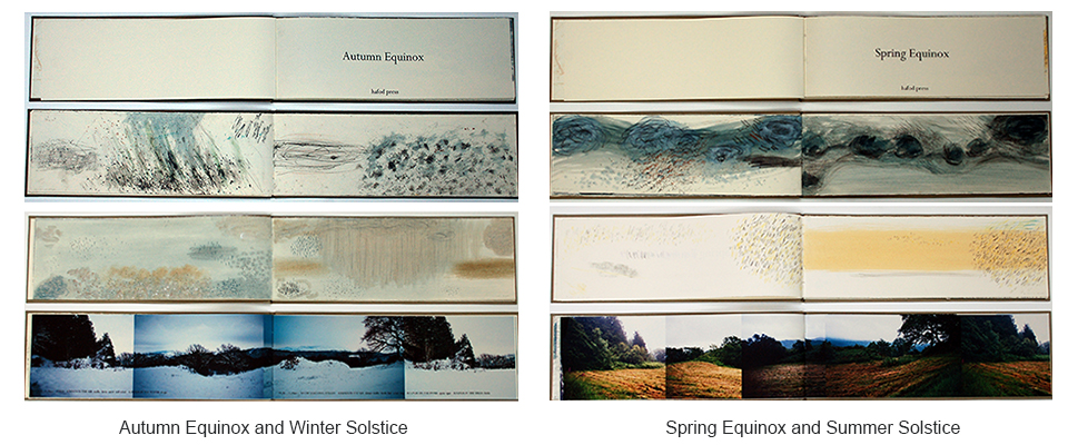 Dawn to Dusk is a series of five one-off artist's books; bound books with boards covered in pale umber fabric with letterpress title; mixed media paintings, digital photographs and text printed with archival ink on 175gsm Somerset book paper; 18 x 52cm closed; signed one-off books; 2012 Dawn to Dusk Solstices and Equinoxes, Hafod studio : four one-off books