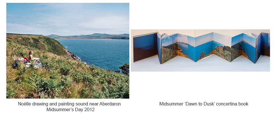 The sound drawings were bound in five unique artist’s books ‘Dawn to Dusk’. Each book contains a record of the day as it unfolded from dawn to dusk in photographs, sound drawings and words. As well as the five unique books, Noelle made a limited edition of concertina books of digital photographs and text for Midsummer's Day. All books are bound in linen and board covers with a letterpress title.