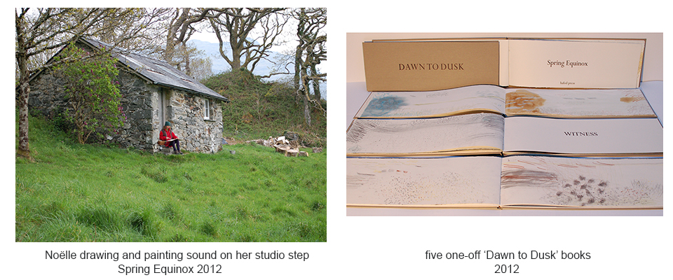 On each of the Solstices and Equinoxes and on Midsummer’s Day, Noelle recorded in words, drawings and photographs the sounds she heard hourly from dawn to dusk. Noelle witnessed the weather and bird sounds of the Solstices and Equinoxes from outside her studio in the mountain woodland of Snowdonia. Midsummer's Day was spent on the coastal headland near Aberdaron.