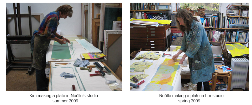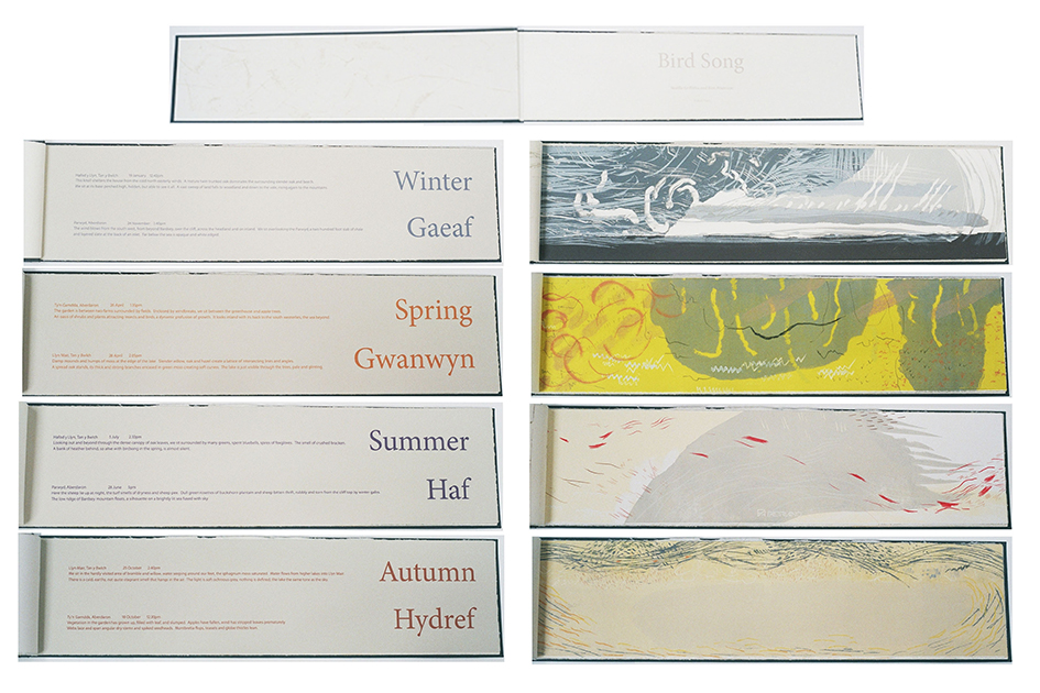 Noelle Griffiths and Kim Atkinson collaborated for 18 months making a large format artists' book. Each season, each artist made half hour sound drawings/paintings (24x100cm) in the landscape at two places near where they each live: Snowdonia woodland at Hafod near Maentwrog and Parwyd, coastal headland near Aberdaron. After making the season's drawings Noelle and Kim created an edition of ten prints combining aspects of each of their drawings. These two very different locations provided very different landscapes, habitat and birds.