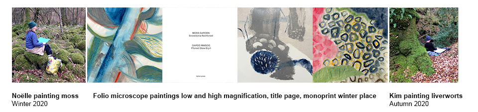 2019 - 2020 In collaboration with Kim Atkinson Moss Garden - Snowdonia Rainforest - edition of five unique folios of paintings, relief prints and digital text (English and Welsh) of eight common mosses and liverworts found in Ceunant Llennyrch, a deciduous woodland near Maentwrog in Snowdonia. Paintings and prints made in response to place, sound and habitat in each season, alongside microscope paintings of each bryophyte at high and low magnification. This woodland forms part of the recently designated Celtic Rainforest, an EU and Welsh Government funded project supported by the Snowdonia National Park, Woodland Trust and RSPB Cymru. See Moss Garden